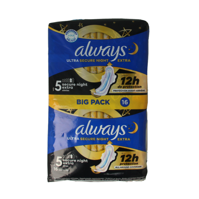 Nie wieder unruhige Nächte? Always Ultra Secure Night, 16 Stück, bietet 12 Stunden vollständigen Schutz von vorne bis hinten. Wachen Sie erfrischt und selbstbewusst auf!