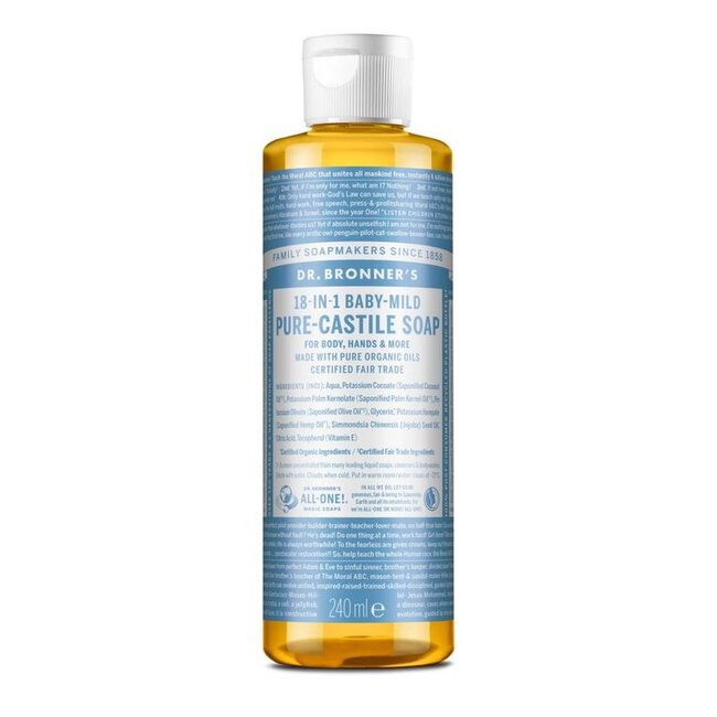 Eine reine Lösung für alles? Die Dr. Bronner's Baby Mild Flüssigseife ist der 18-in-1 Bio-Allzweckreiniger für Ihre Familie und Ihr Zuhause. Sie ist mild für jede Haut und frei von synthetischen Zusätzen. Erleben Sie höchste Qualität und eine durchdachte, plastikfreie Pflege zu einem günstigeren Preis über VitAdvice. Ihre verantwortungsvolle und kostengünstige Wahl.