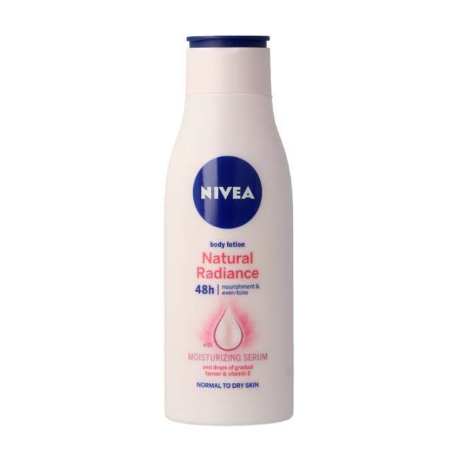 Die neue Nivea® Natural Radiance Körperlotion mit feuchtigkeitsspendendem Serum, Vitamin E und einigen kleinen Tropfen eines schrittweisen Selbstbräuners bietet Ihnen 3 Effekte in einem Produkt: