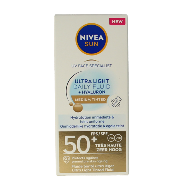 Suchen Sie nach dem ultimativen Gesichtsschutz, der gleichzeitig pflegt? Das Nivea Sun Gesichts-Tagesfluid LSF 50 getönt mittel bietet ultraleichten UVA-/UVB-/Blaulicht-Schutz. Angereichert mit Hyaluron für Hydratation und einer matten, gleichmäßigen Deckkraft, die Unebenheiten kaschiert. Schweißbeständig und nicht klebrig. Fühlen Sie sich den ganzen Tag selbstbewusst! VitAdvice: Von Experten unterstützte Qualität für die Familie, preisgünstig und plastikfrei. Ihre bewusste Wahl für strahlende Haut.