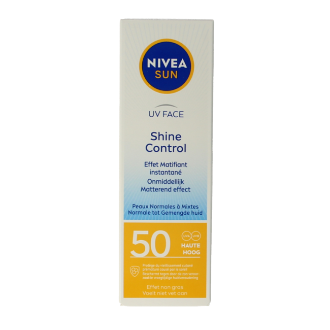 Entdecken Sie Nivea Sun UV Gesicht Glanzkontrolle LSF 50. Diese leichte Formel bietet Ihnen sofortigen, leistungsstarken UVA/UVB-Schutz vor Hautschäden und Hautalterung. Gleichzeitig aktiviert ein natürliches Antioxidans die hauteigene Abwehr. Ihr Gesicht sieht den ganzen Tag frisch und matt aus, ohne ein fettiges Gefühl zu hinterlassen. Es ist die ideale Wahl für den täglichen Gebrauch und ist zudem ophthalmologisch zugelassen, was es sicher und angenehm für die empfindliche Haut um die Augen macht.