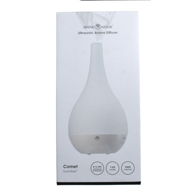 Serene House Aroma diffuser comet wit Prachtig ontworpen diffuser met een moderne, elegante vorm. De diffuser werkt tot 8 uur continu of tot 16 uur met tussenpozen, heeft een timer voor 60, 90 of 120 minuten en 7 roterende LED kleuren.
