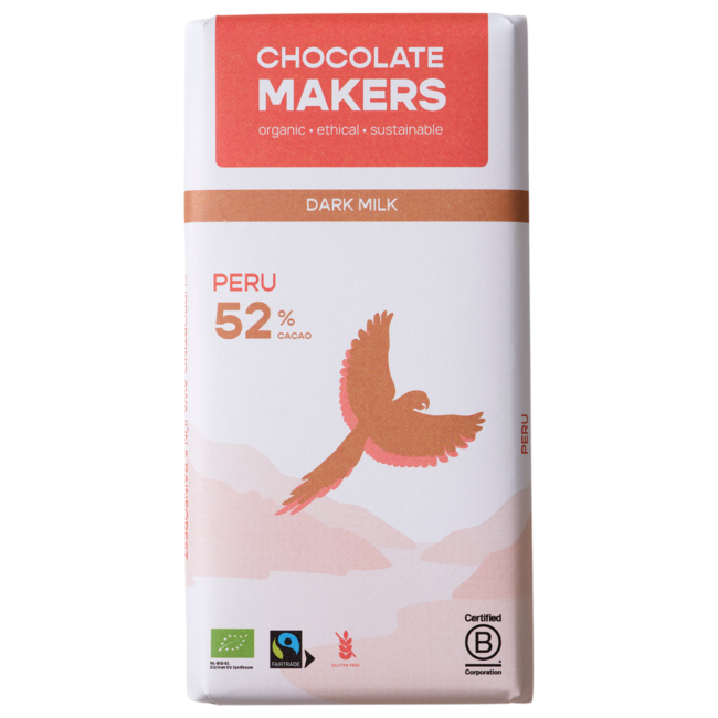 Chocolatemakers Awajun 52% dark milk: a smart, conscious indulgence. Pure organic, Fairtrade quality from Peruvian Criollo cocoa. 100% plastic-free, solar-powered production, and gluten-free. For the whole family. Enjoy responsibly!