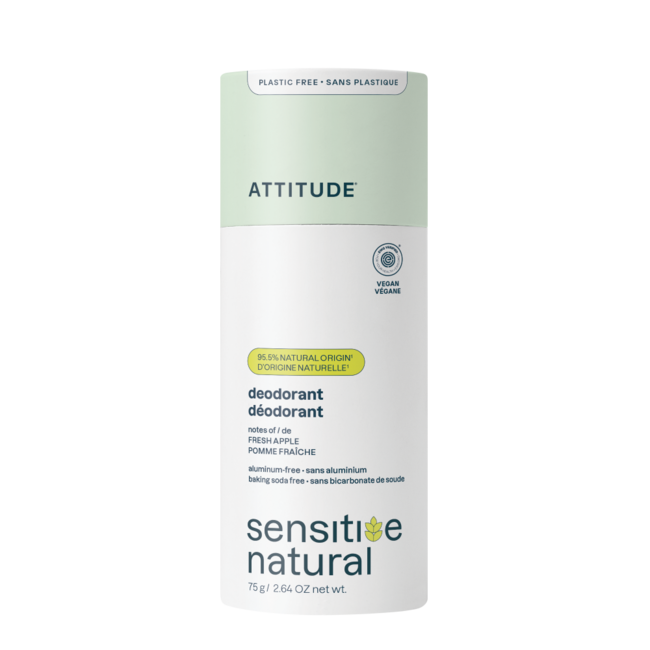 ATTITUDE Super leaves veganistische deodorant voor de gevoelige huid is gemaakt met 96% natuurlijke ingrediënten en combineert de geur van frisse appel met nuances van rozemarijn. Het bevat geen baksoda, is dermatologisch getest en verrijkt met kalmerend
