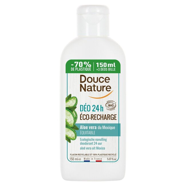 Experience Douce Nature Aloe Vera Deodorant refill: 24-hour protection and hydration for all skin types, thanks to organic aloe vera. No irritation, just long-lasting freshness!