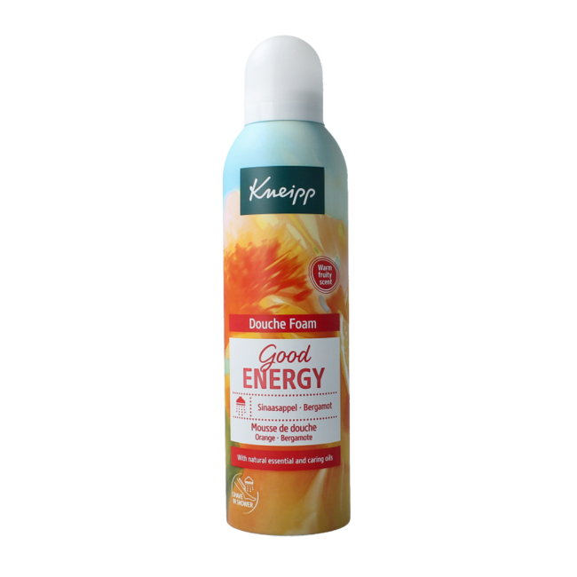 Kneipp Douchefoam good energy Jouw dagelijkse feel-good moment onder de douche: deze rijk schuimende Kneipp® Douche Foam Good Energy. Deze douche foam met een warme, fruitige geur met etherische bergamot- en sinaasappelolie zorgt, in combinatie met waardevolle biologische saffloerolie, voor energieke momenten en laat je stralen. Geniet van het zachte verzorgende schuim, voor een verfrissend douche moment. Ook geschikt voor het scheren tijdens het douchen.