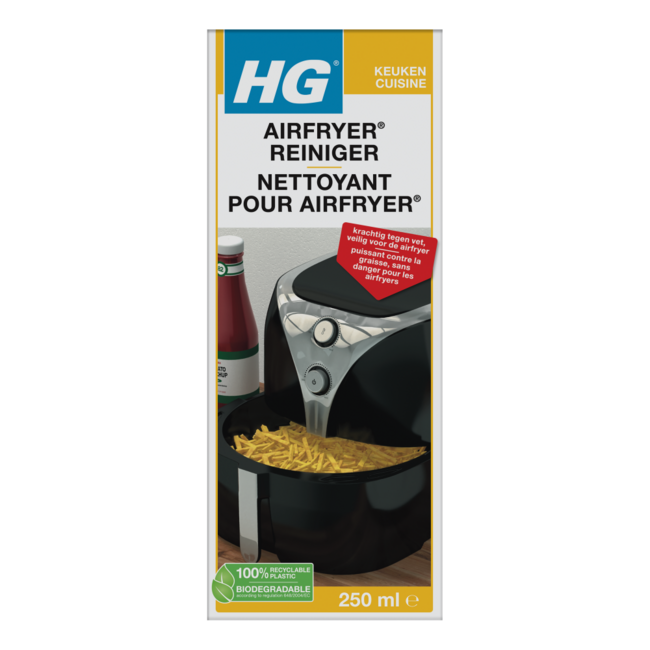 Discover HG Air Fryer Cleaner. This unique, patented product has been specifically developed to clean deeply without affecting your air fryer. A solution that is as powerful against dirt as it is gentle on your appliance.