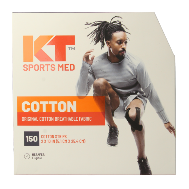 KT Tape Original® is voorgesneden en direct uit de doos klaar om aan te brengen. Voorgesneden strips hebben afgeronde hoeken die helpen voorkomen dat de hoeken aan kleding blijven haken of dat de randen gaan rafelen. Elke rol bevat 150 voorgesneden strips die 25,4cm lang en 5,1cm breed zijn. - Katoen