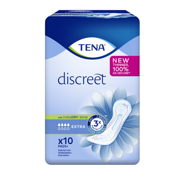 TENA Discreet Extra (medical device) provides security for bladder weakness. InstaDRY™ technology keeps the surface dry and fresh instantly. It features triple protection and a silky soft fit. Trust VitAdvice for expert quality; a smart choice for comfort and peace of mind.