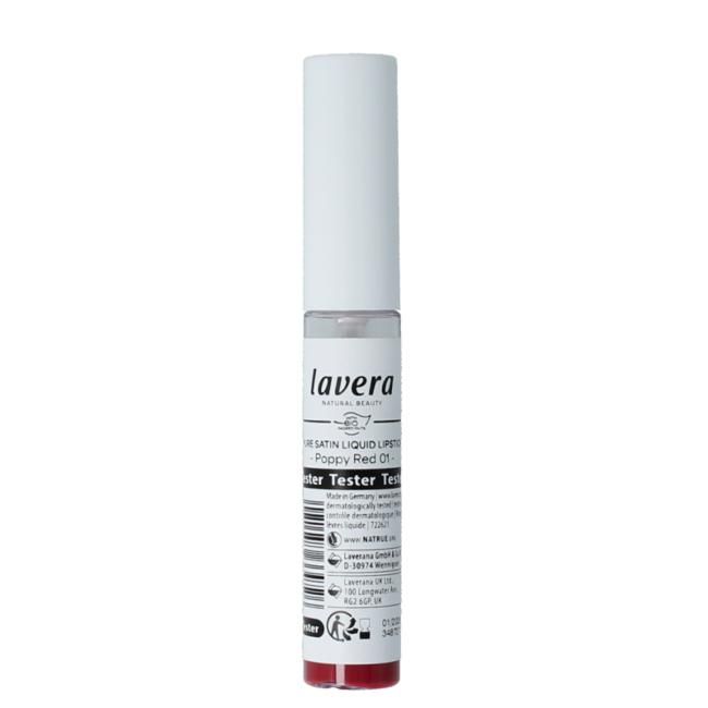 Lavera Lipstick liquid poppy red 01 bio tester De unieke textuur van lavera Pure Satin Liquid Lipsticks zorgt voor een sterk gepigmenteerd, voedend kleurresultaat.