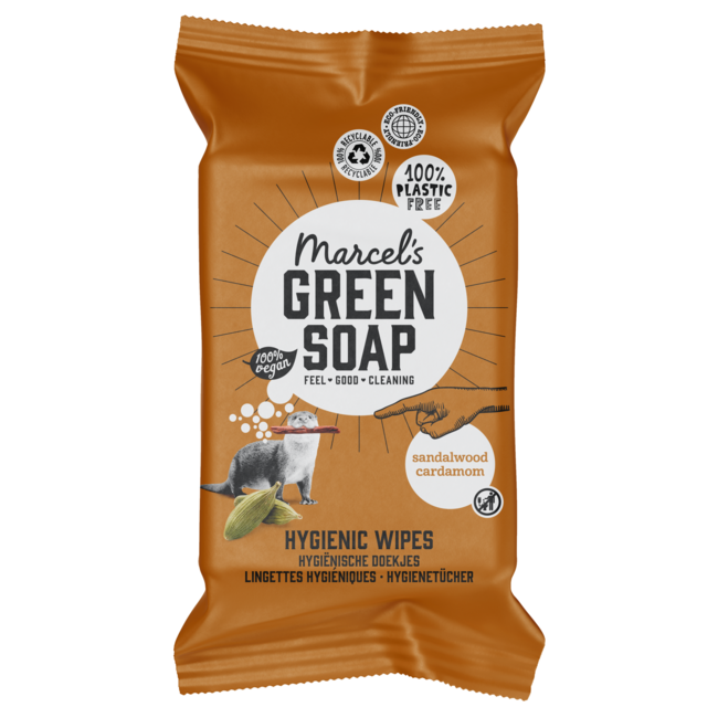 Discover the refreshing approach of Marcel's Green Soap Cleansing Wipes Sandalwood & Cardamom. These wipes are your smart choice for a spotless home and peace of mind. Made from 100% biodegradable plant-based fibres – a blend of eucalyptus and acacia – they offer the power of nature for a hygienic clean. You wipe away dirt and bacteria with a pleasant scent of sandalwood and cardamom, without harsh chemicals.