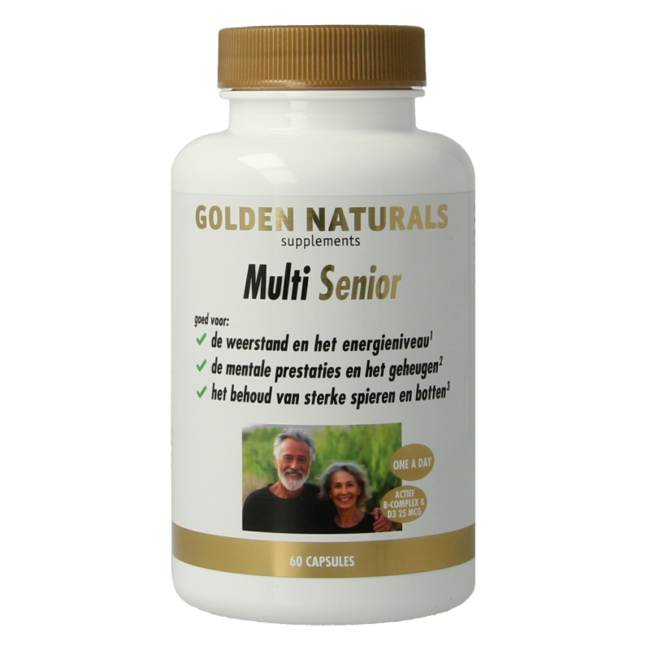 Golden Naturals Multi seniorNaarmate de jaren vorderen, verandert het lichaam en zo ook de behoefte aan vitaminen en mineralen. Golden Naturals Multi Senior is toegespitst op ‘de senior’ (60+) en dient als aanvulling op de dagelijkse voeding. Naast vitaminen zoals B12 en vitamine C bevat Multi Strong Gold Senior foliumzuur (folaat) en vitamine A. Aan deze multi zijn verder enkele andere nuttige nutriënten toegevoegd, namelijk luteïne, zeaxanthine, calcium, co-enzym Q10 en de pterostilbeen. Multi Senior is vrij van koper en ijzer (geen risico op stapeling).