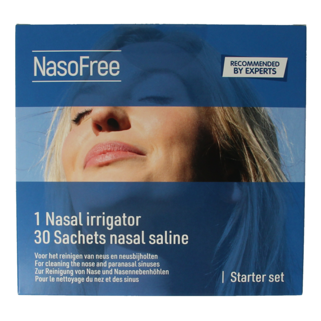 The NasoFree Starter Set offers natural relief. With the nasal douche and 30 sachets of nasal rinsing salt, you can effectively clean your nose and sinuses. Experience immediate improvement with: