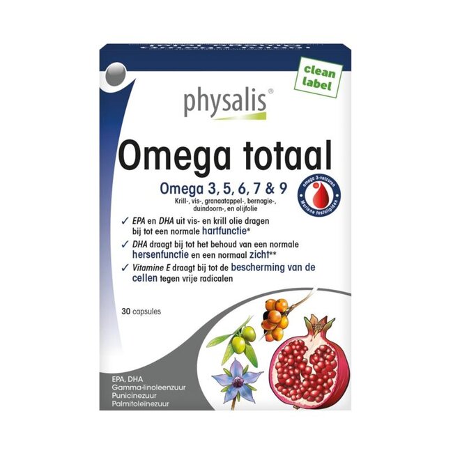 The intake of unsaturated fatty acids is essential. Physalis Omega Total provides a full spectrum of all omega fatty acids from marine and plant origins. It is a complex of 5 omega fatty acids, derived from high-quality fish oil, krill oil, and plants such as borage, sea buckthorn, pomegranate seed, and olives.