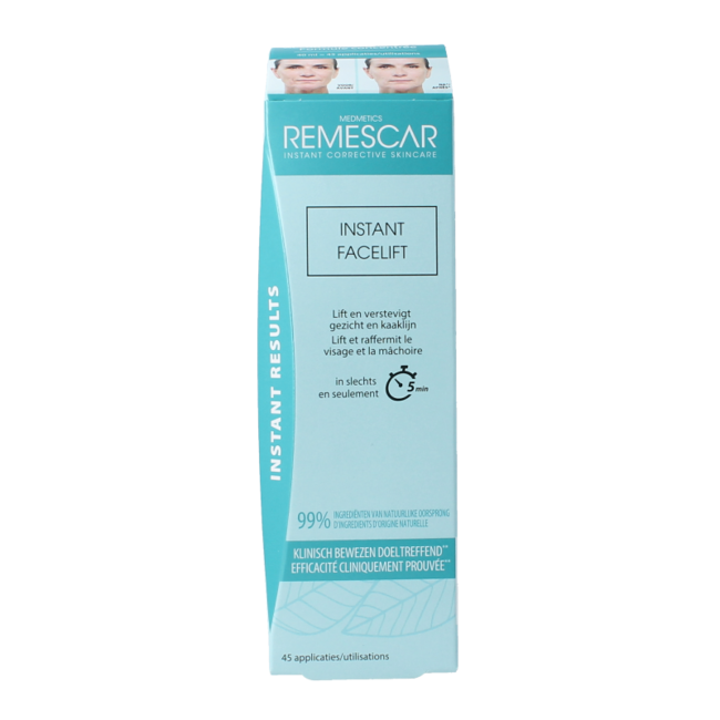 Apply Remescar Instant Facelift Cream to the areas to be treated as indicated above. Allow the product to dry for at least 5 minutes. If you notice a white residue, you have used too much product or have not applied a moisturiser. Remove the white residue with a little water. After applying Remescar Instant Facelift Cream, you may apply your make-up, but avoid oil-based make-up as this can reduce the effectiveness of Remescar Instant Facelift Cream.