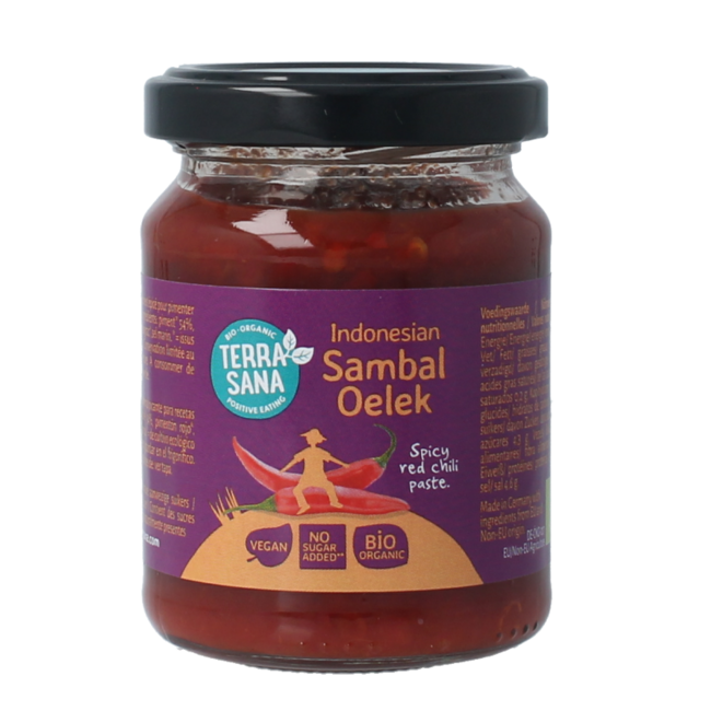Sambal oelek bioZorg je graag voor een pittige kick voor je gerechten? Probeer dan onze Sambal Oelek. Gemaakt met zo min mogelijk toevoegingen. Dat betekent dat er géén suiker of olie is toegevoegd. En dat is superlekker bij je Aziatische gerecht, op brood, of eigenlijk ieder gerecht dat wel wat pit kan gebruiken. Natuurlijk extra onmisbaar in de Indonesische keuken, bij je nasi of bami.