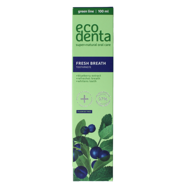 Ecodenta Tandpasta fresh breath bosbessenextr green line Verfrissende tandpasta met bosbessenextract. Bosbessen en munt – gewoon een zomer recept in een tube tandpasta! Deze tandpasta met uitzonderlijk frisse smaak helpt van een mooie glimlach elke dag genieten, ongeacht het seizoen. Onze zorgvuldig samengestelde formule helpt niet alleen tandplak te voorkomen, maar maakt je tanden ook effectiever witter en geeft je een fris gevoel alsof je een handvol bosbessen hebt gegeten en een kopje heerlijkste muntthee hebt gedronken.