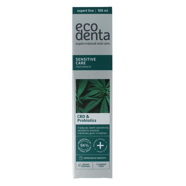 Ecodenta Tandpasta sensitive CBD probiotica expert line Tandpasta voor gevoelige tanden met CBD en probiotica. Deskundige innovaties voor een nog betere glimlach. Deze tandpasta met CBD en probiotica reinigt niet alleen reinigt je tanden op milde wijze en helpt tandplak en tandsteen te bestrijden, maar helpt ook tandvleesirritatie te verminderen en versterkt tanden en tandvlees. De cannabidiol in de formule heeft antioxiderende eigenschappen en de probiotica ondersteunen de algehele mondgezondheid. Aanbevolen voor volwassenen.
