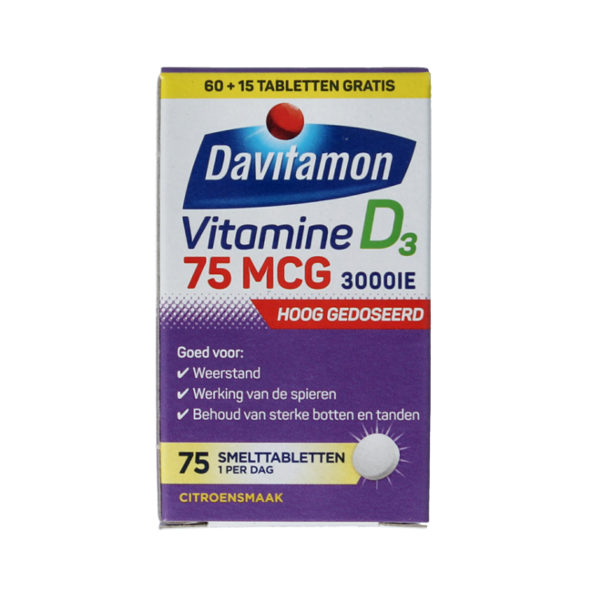 Davitamon Vitamine D 75mcgDavitamon Vitamine D3; 75 mcg is een voedingssupplement met een dosering van 75 microgram vitamine D₃ per smelttablet. Deze hoog gedoseerde smelttabletten zijn speciaal ontwikkeld voor volwassenen als aanvulling op de voeding en bedoeld voor tijdelijk gebruik.