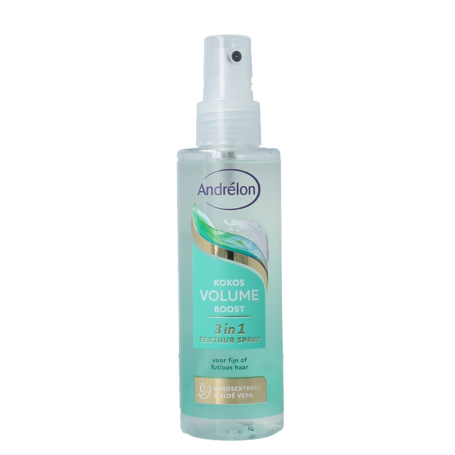 Andrelon Volumespray verzorgend kokos Andrelon kokos volume boost 3in1 textuur spray. Voor fijn of futloos haar. Met kokosextract & aloë vera.