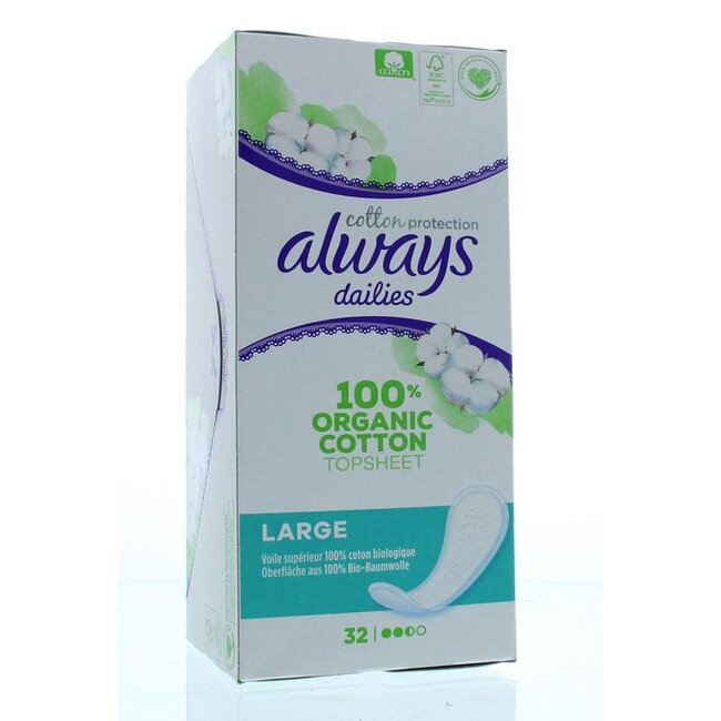 ¿Sufre de irritación o molestias? Elija Always Dailies Cotton Protection: 100% algodón orgánico para una comodidad y frescura máximas. Sin perfume ni colorantes, dermatológicamente testados. Estos salvaslips grandes y transpirables ofrecen una seguridad discreta.
