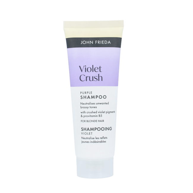 Los tonos amarillentos no deseados pueden hacer que su color rubio se vea apagado. El champú morado Violet Crush neutraliza los tonos anaranjados al instante con pigmentos concentrados. Su cabello se transforma de un tono apagado y cálido a un rubio fresco, luminoso y brillante.