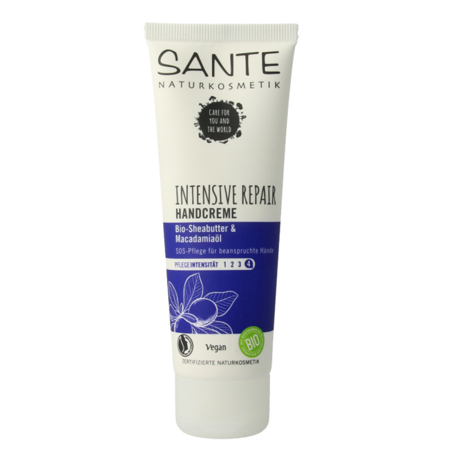 ¿Manos secas? ¡Elija la Crema de Manos Reparadora Intensiva Sante! La manteca de karité ecológica y el aceite de macadamia nutren intensamente, se absorben rápidamente y no dejan sensación grasa.