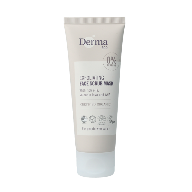 Derma Eco Face Scrub es una mascarilla exfoliante multifuncional que actúa como un exfoliante limpiador y como un peeling químico. Con una combinación de un 5% de ácido láctico (AHA) y partículas exfoliantes físicas, se eliminan las células muertas de la