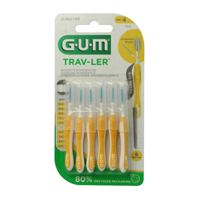 El cepillo interdental GUM Trav-ler de 1,3 mm (amarillo) permite una limpieza profunda, eliminando hasta un 25% más de placa y manteniendo propiedades antibacterianas durante 14 días. Su mango flexible facilita el acceso a todos los espacios interdentales. VitAdvice ofrece calidad profesional a un precio competitivo.