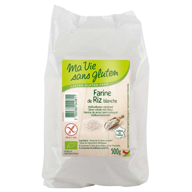 La harina de arroz es una harina base esencial para la preparación de masas de pan, tartas o repostería sin gluten.