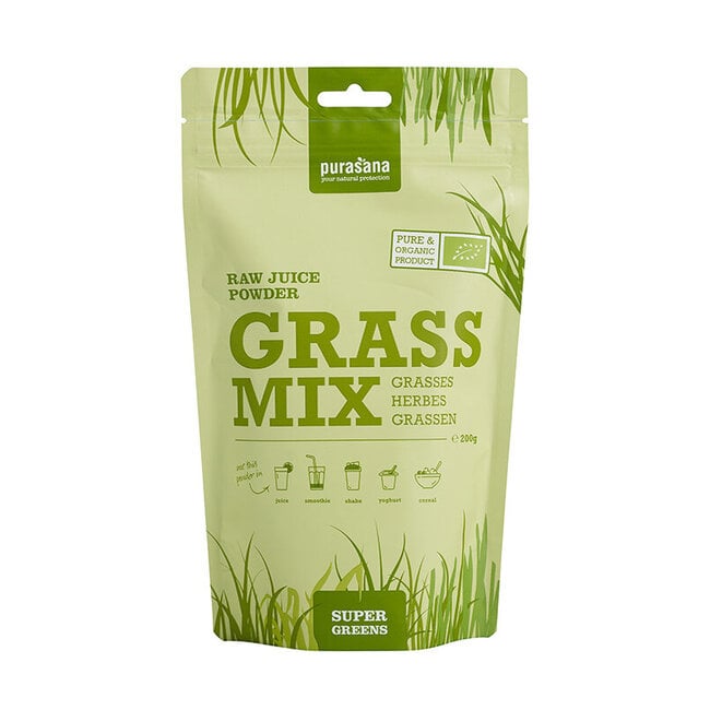 Esta exclusiva mezcla biológica de hierbas de Purasana combina la fuerza del jugo de hierba de cebada, jugo de hierba de trigo, jugo de alfalfa, jugo de KAMUT® khorasan y jugo de hierba de avena en polvo.