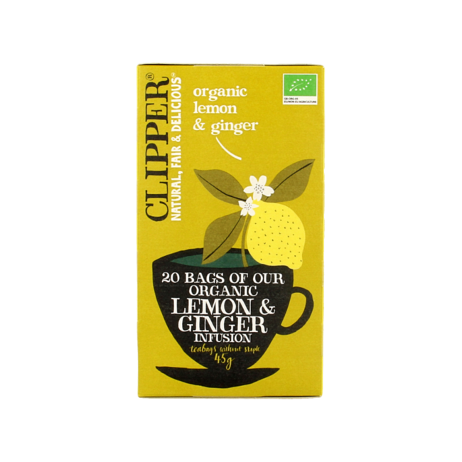 Este té de limón y jengibre ecológico de Clipper es una mezcla de limoncillo*, raíz de jengibre* (15%), raíz de regaliz*, cáscara de limón* (12%), aroma natural y aroma natural de jengibre. (*ingrediente de cultivo ecológico).