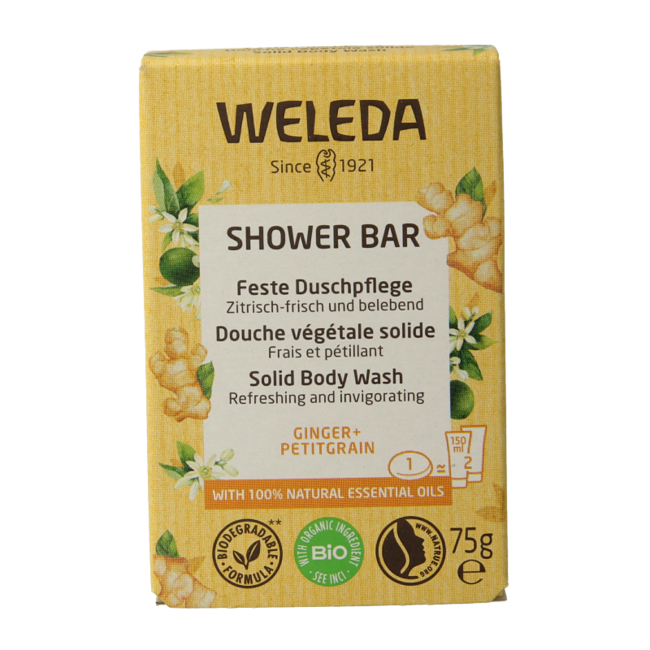 Refresca y cuida tu piel con la pastilla de ducha Weleda de jengibre y petitgrain. Esta pastilla activadora y biodegradable con manteca de karité ofrece una fragancia 100 % natural. Ideal para toda la familia. En VitAdvice: hasta un 30 % más económico y con envío sin plásticos. Tu elección inteligente y sostenible.