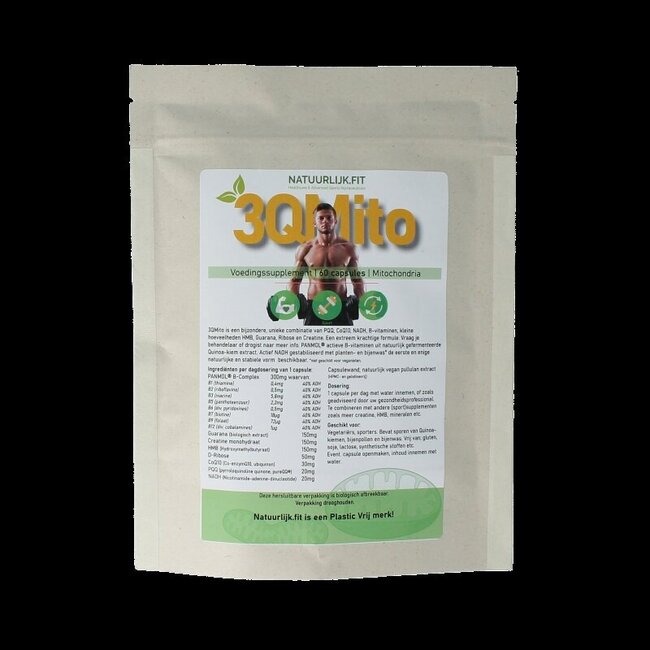 Natuurlijk.fit 3qmito3QMito is een bijzondere, unieke combinatie van PQQ, CoQ10, NADH, B-vitaminen, kleine hoeveelheden HMB, Guarana, Ribose en Creatine.