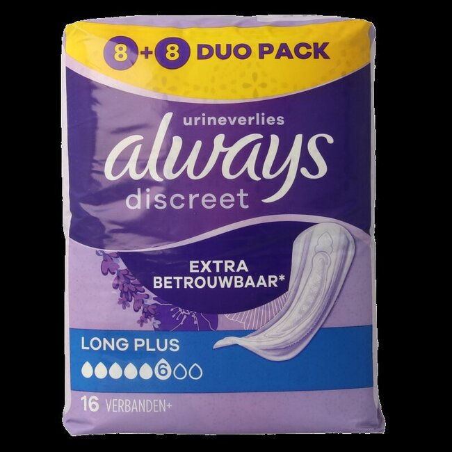 Des préoccupations concernant les fuites urinaires ? Retrouvez votre confiance avec Always Discreet Long+ ! Une protection discrète et super-absorbante ; les technologies Odour Lock et LeakGuards vous gardent au sec et au frais toute la journée.