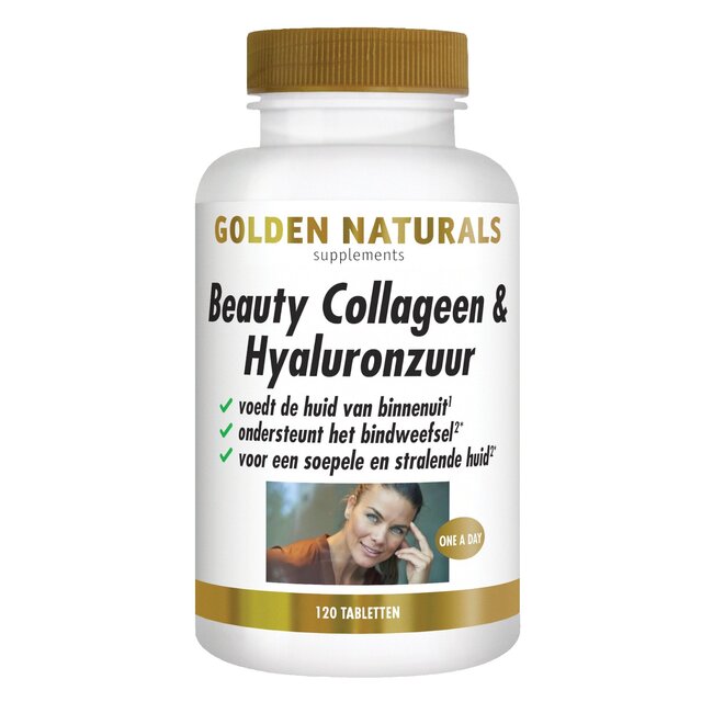 Golden Naturals Beauty Collagène & Acide Hyaluronique est une préparation à base de plantes, vitamines, minéraux et acides aminés. Elle contient des micronutriments essentiels tels que l'acide hyaluronique, la L-cystéine, l'astaxanthine, le silicium organique (50 mg), les stigmates de maïs et l'extrait de safran. Elle contient également deux types différents de collagène (I et V).