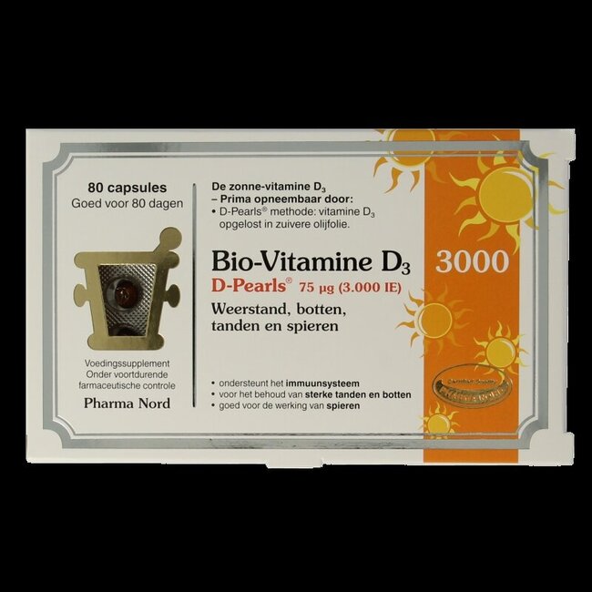 Pharma Nord Bio-Vitamine D3 3000 UI D-Pearls apporte 75 μg (3000 UI) de vitamine D3 pure, dissoute dans de l'huile d'olive pressée à froid pour une absorption optimale. Favorisez la solidité de vos os, la souplesse de vos muscles et un système immunitaire robuste avec ces capsules faciles à ingérer pour toute personne dès l'âge de 11 ans.