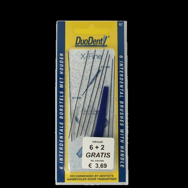 Assurez une hygiène bucco-dentaire complète. Les brossettes interdentaires Duodent x-fine (0,7/3,5 mm) atteignent les zones inaccessibles à votre brosse à dents. Pour des gencives plus saines et une haleine fraîche. Support inclus. Une qualité pour toute la famille, avec la valeur de VitAdvice.