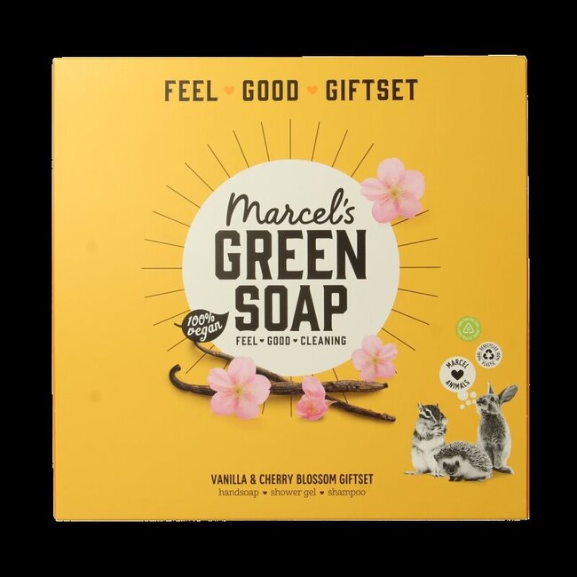 Contenu du coffret cadeau Marcel's Green Soap vanille et fleur de cerisier :