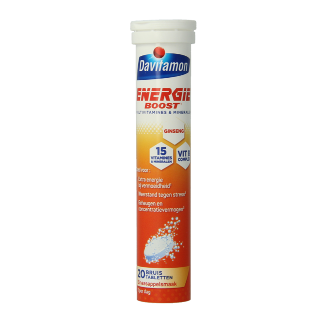 Davitamon Boost d'énergie ginseng combine toutes les vitamines essentielles quotidiennes et les minéraux cuivre, fer et zinc avec de l'extrait de ginseng dans un seul comprimé effervescent.