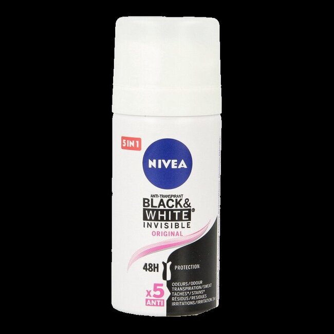 Zéro tache, une confiance absolue. Dites adieu aux traces blanches sur vos vêtements noirs et aux taches jaunes sur vos vêtements blancs. Le mini déodorant NIVEA Invisible for Black & White offre 48 heures de protection fiable tout en préservant la qualité de vos textiles. Profitez d'une sensation de fraîcheur tout au long de la journée. Produit testé sous contrôle dermatologique, sans alcool.