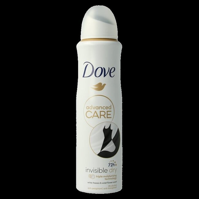 Sans transpiration ni taches pendant 72 heures ! Le spray Dove Invisible Dry protège et prend soin de vos aisselles grâce à la technologie Triple Moisturising et un parfum frais de freesia et de violette. Approuvé par PETA. Choisissez VitAdvice : des soins personnels intelligents et honnêtes pour toute la famille, sans plastique. Sentez-vous frais et confiant !