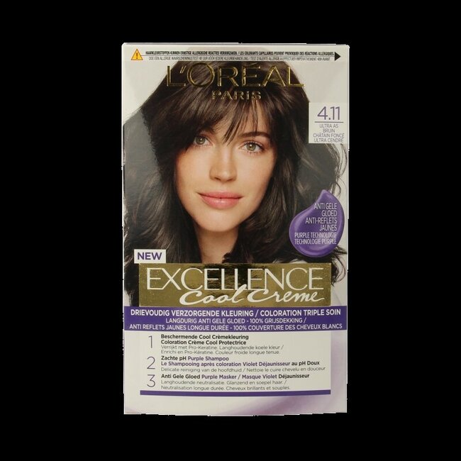 Zéro cheveu blanc, pas de reflets chauds ! L'Oréal Paris Excellence Cool Crème 4.11 châtain ultra cendré offre une couverture à 100 % des cheveux blancs et une couleur froide durable. Découvrez le triple soin à la pro-kératine, au shampooing pH neutre et au masque anti-reflets jaunes. Pour des cheveux forts et brillants et un look affirmé. Le choix idéal pour un résultat magnifique et longue durée.