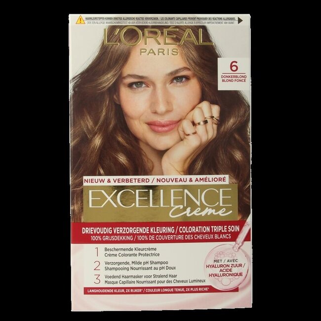 Découvrez L'Oréal Paris Excellence Crème 6 Blond Foncé, une coloration permanente qui assure une triple protection de vos cheveux. Plus qu'une simple couleur, ce soin renforce, protège et nourrit la fibre capillaire. Obtenez une nuance blond foncé naturelle avec une couverture totale des cheveux blancs pour un résultat uniforme et radieux.