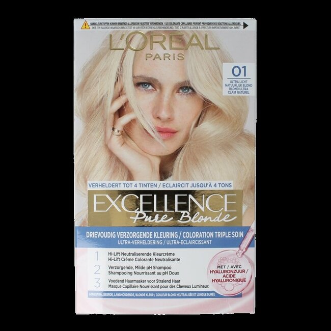 Le kit L'Oréal Excellence Excellence Blond 01 Blond Naturel permet d'obtenir une coloration blonde naturelle tout en protégeant la fibre capillaire. Ce produit propose un soin triple action intervenant avant, pendant et après le processus de coloration pour assurer une couleur durable et des cheveux souples.