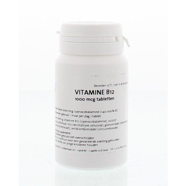 Vitamine B12, agent de charge (phosphate dicalcique, cellulose microcristalline), agent d'enrobage (acide stéarique, stéarate de magnésium), antiagglomérant (dioxyde de silicium).
