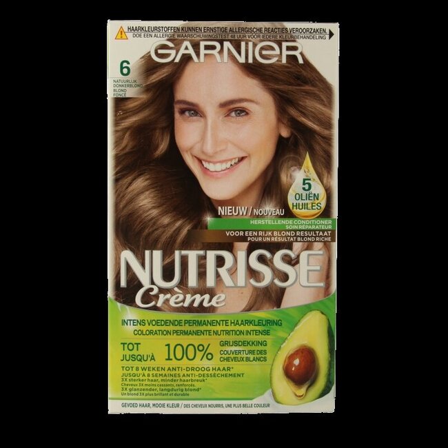 Cheveux ternes ? Cheveux blancs ? Garnier Nutrisse Crème 6 Cannelle offre une couverture à 100 % des cheveux blancs et une couleur riche et durable. Grâce à 5 huiles nourrissantes (dont l'argan), vos cheveux deviennent 3 fois plus forts et soyeux. Une vitalité éclatante ! Un soin capillaire premium pour toute la famille, disponible en toute confiance via VitAdvice.