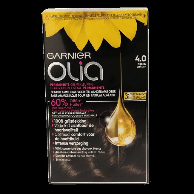 Garnier Olia 4.0 brun est la solution ! Cette formule sans ammoniaque, enrichie en huiles florales, offre 3x plus de brillance et améliore la qualité des cheveux. Profitez d'une couverture à 100% des cheveux gris et d'un résultat couleur profond et intense avec un parfum agréablement délicat. Vos cheveux sont soyeux et nourris.