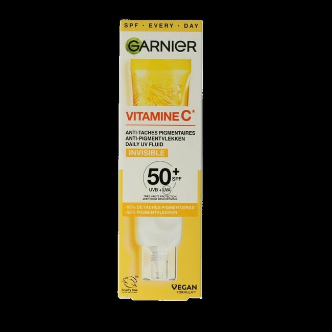 Le fluide quotidien Garnier Vitamine C* Daily UV SPF 50+ protège contre les rayons UV. Sa formule végane à la vitamine C* aide à prévenir les taches et favorise un teint uniforme et éclatant. Ce produit est conçu sans plastique pour toute la famille.
