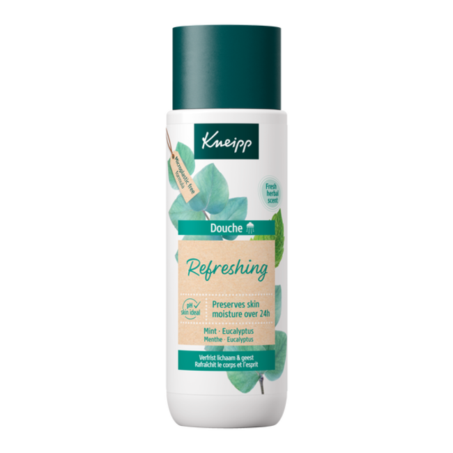 Le gel douche rafraîchissant Kneipp contient de la menthe naturelle et de l'eucalyptus pour un nettoyage doux. Sa formule préserve le microbiome et hydrate la peau. Ce produit convient à l'ensemble de la famille. Distribué par VitAdvice avec un emballage sans plastique.